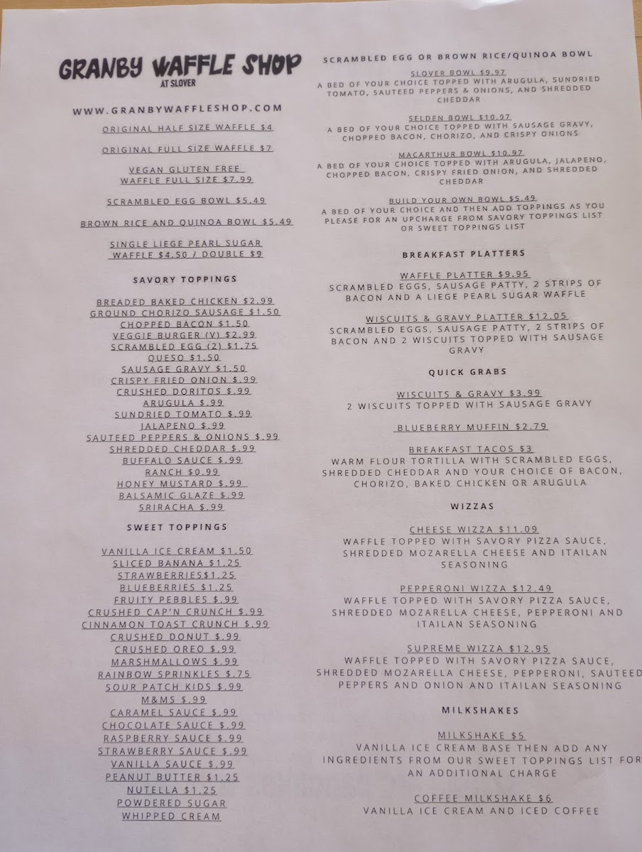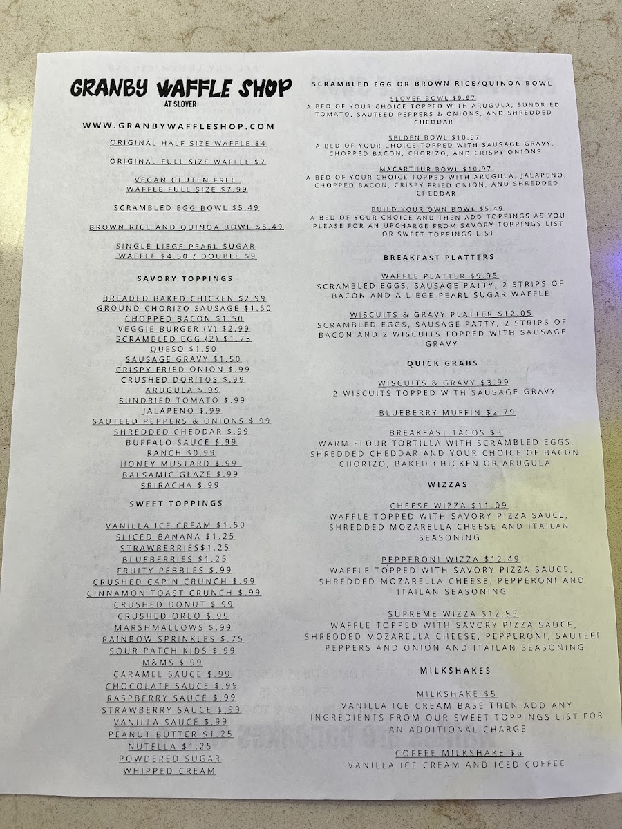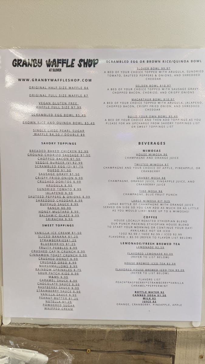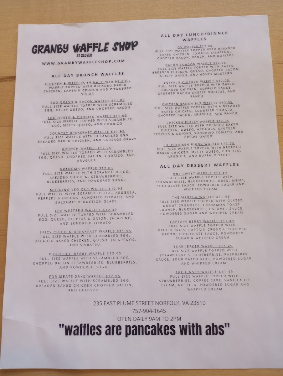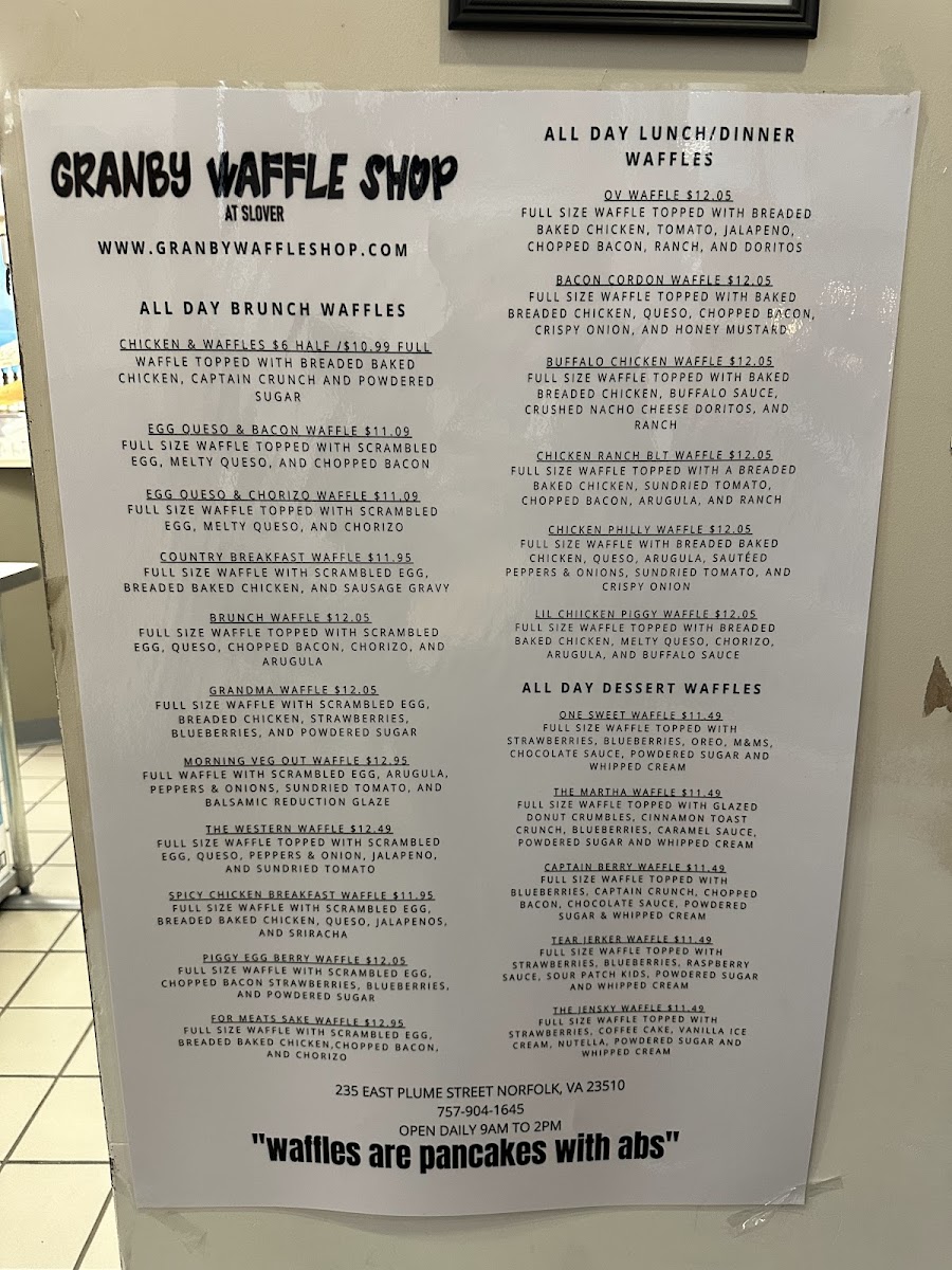 Welcome to the Granby Waffle Shop at Slover, a delightful haven located at 235 E Plume St, Norfolk, VA. Their menu is a waffle lover’s dream, offering an array of savory options that redefine breakfast classics. Each dish is crafted with care, featuring the Morning Veg Out Waffle, topped with fluffy scrambled eggs, sautéed peppers, and a luscious balsamic glaze for just $12.95.